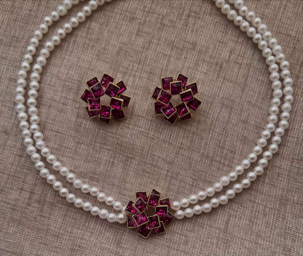 Élégante parure composée d’un collier à double rang de perles blanches raffinées, sublimé par un motif floral serti de cristaux fuchsia éclatants