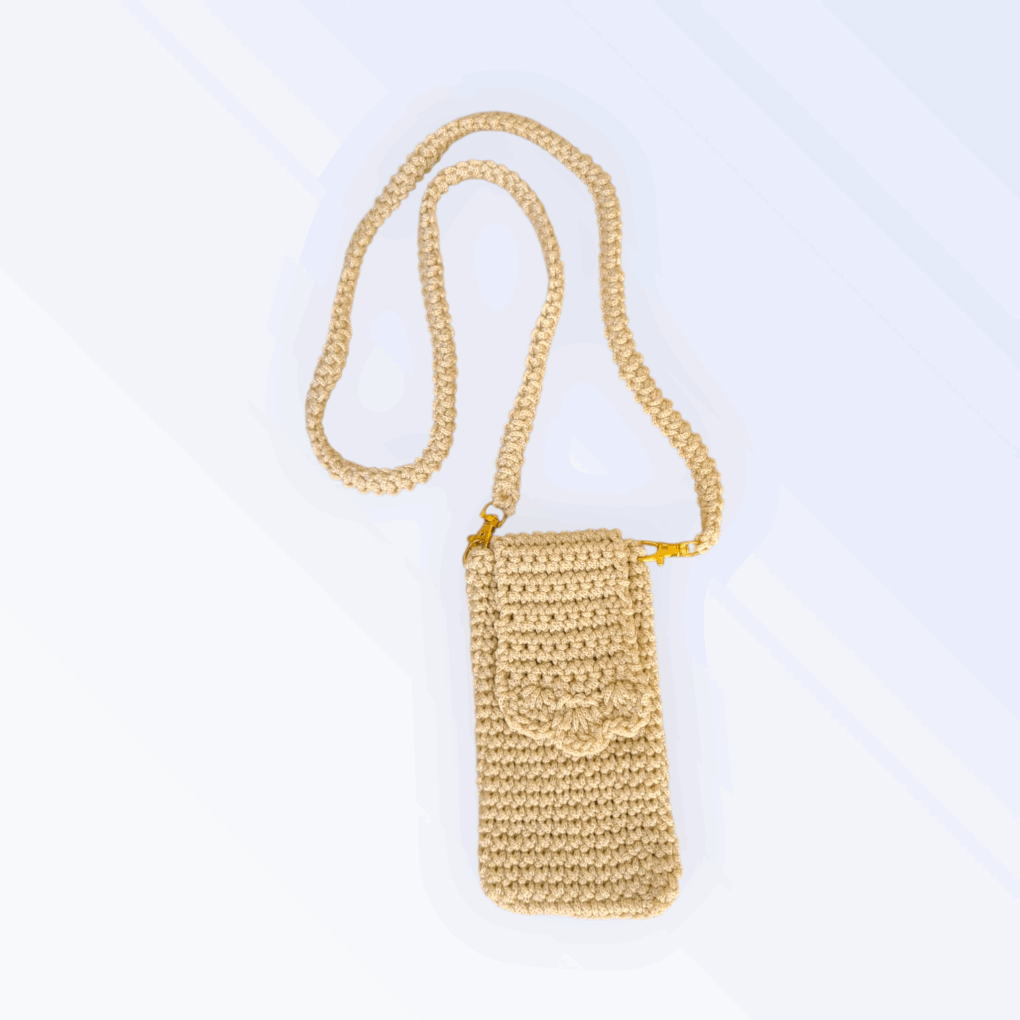 Pochette téléphone portable au crochet en macramé beige fait main, 15×9 cm.