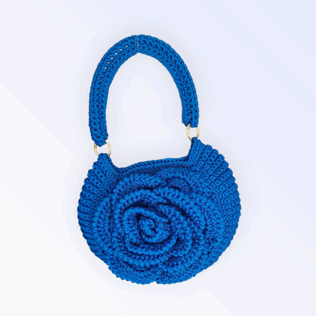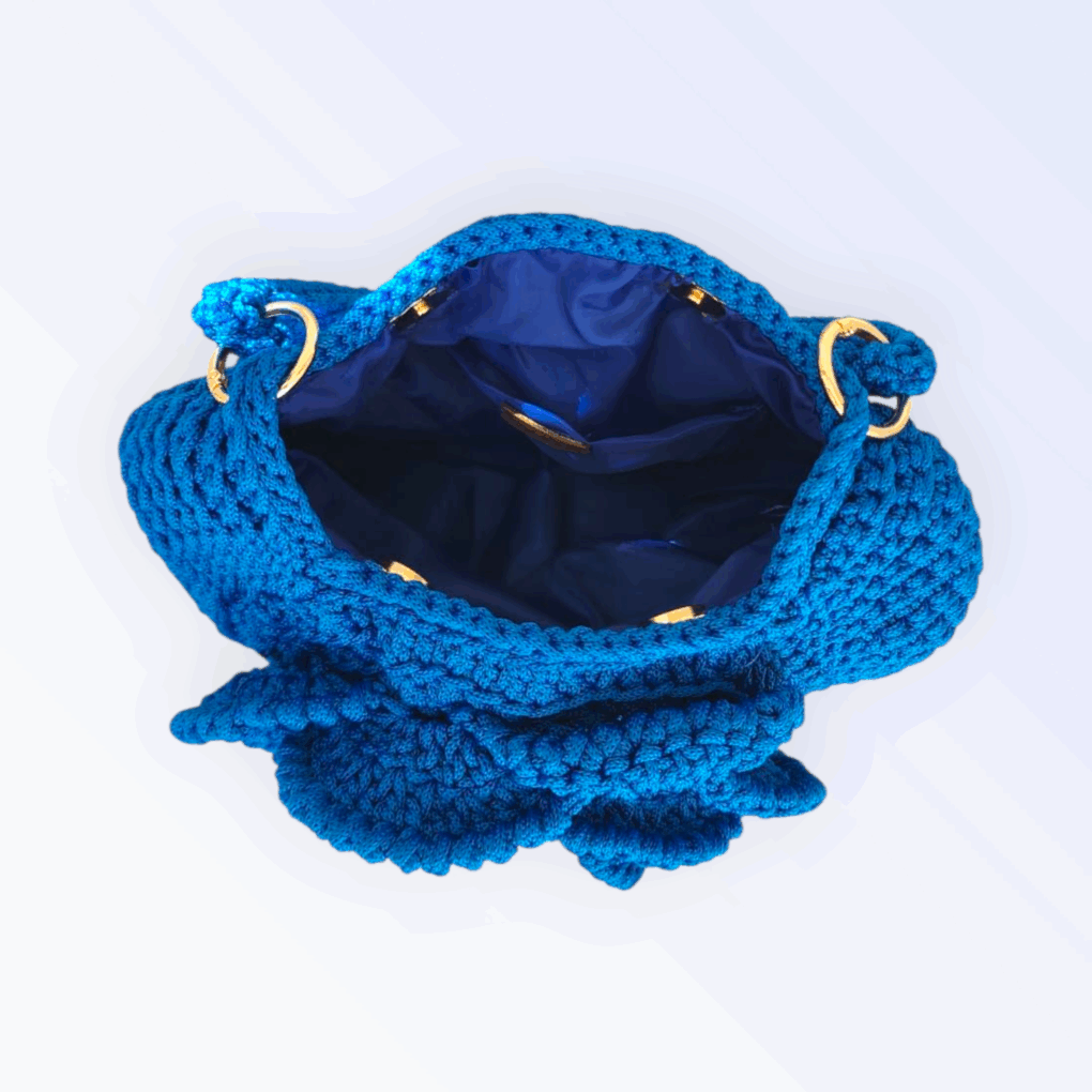 Sac à main au crochet en macramé bleu denim fait main, taille moyenne lar 30 cm × long 25 cm.