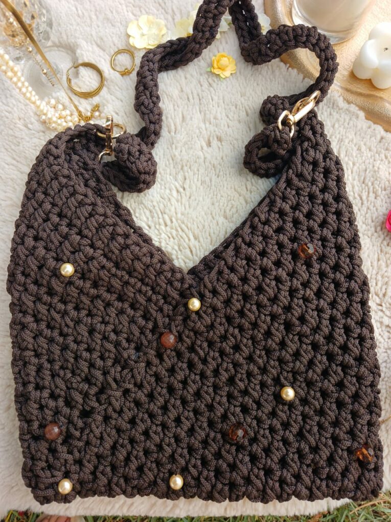 Sac fait à main en crochet couleur marron avec des perles et chaine en crochet
